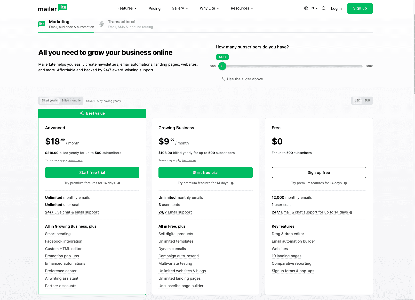 With MailerLite, all plans cover up to 500 subscribers, and pricing adjusts as your subscriber count grows beyond that. I started with the free plan to test the features and only upgraded when my list expanded, which helped me save money while scaling effectively.